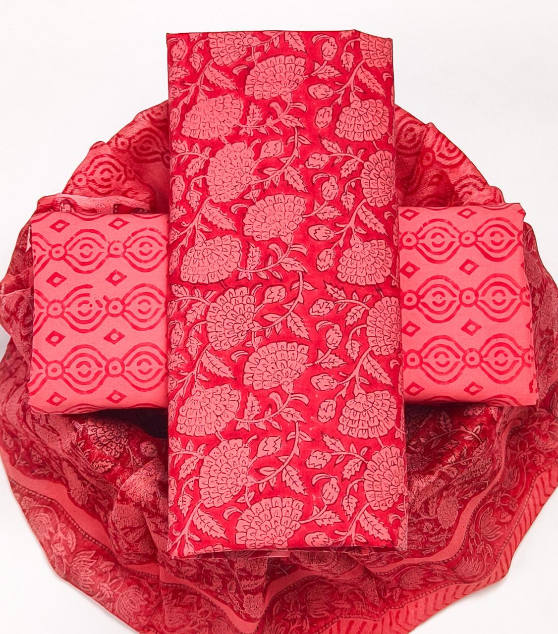 Pure Cotton Hand Block Printed Suit Set With Chiffon Dupatta
